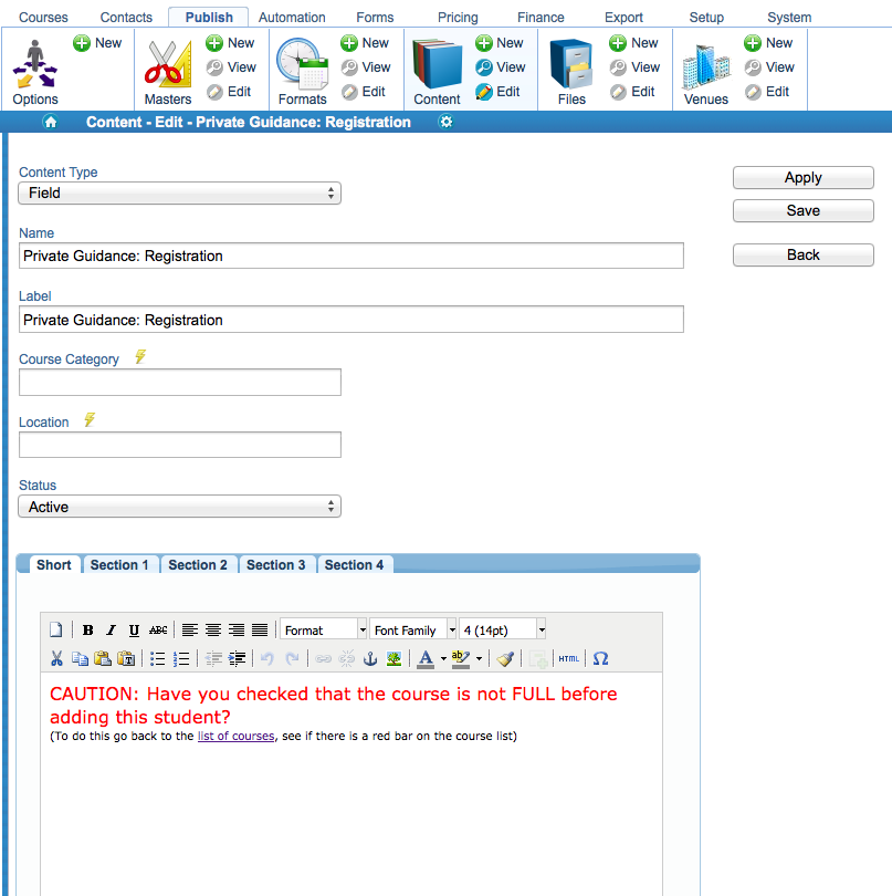 • When naming your content, fields and form it is recommended that you use a standard convention, eg ‘Private guidance’ and ‘Public guidance’ to distinguish between the two types that might appear on process step vs extranet or document forms.