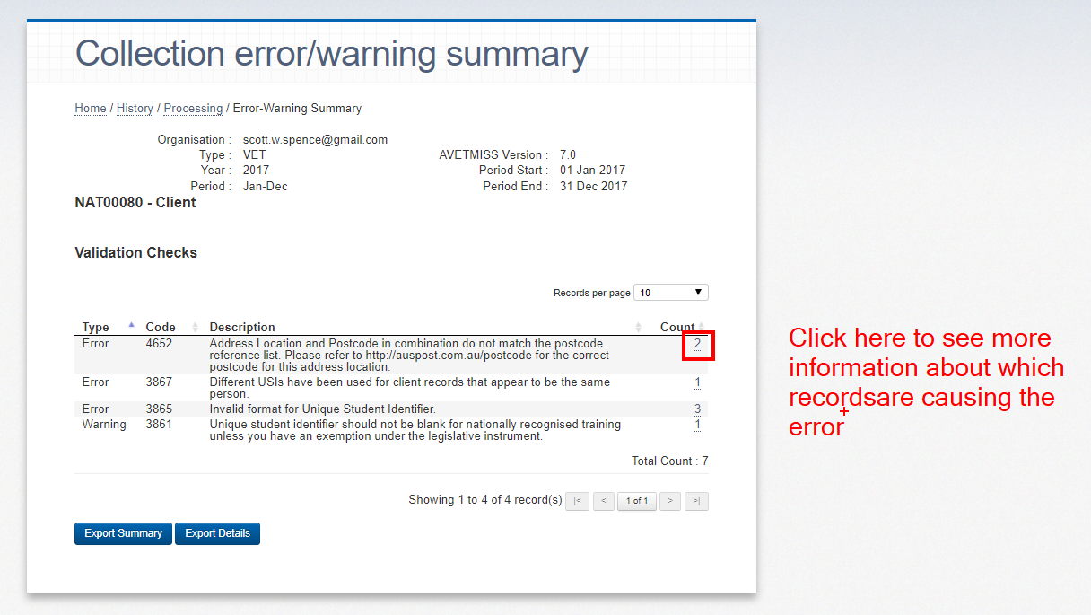 Filter the logs using the AVETMISS export batchid and choose ‘data_warnings’